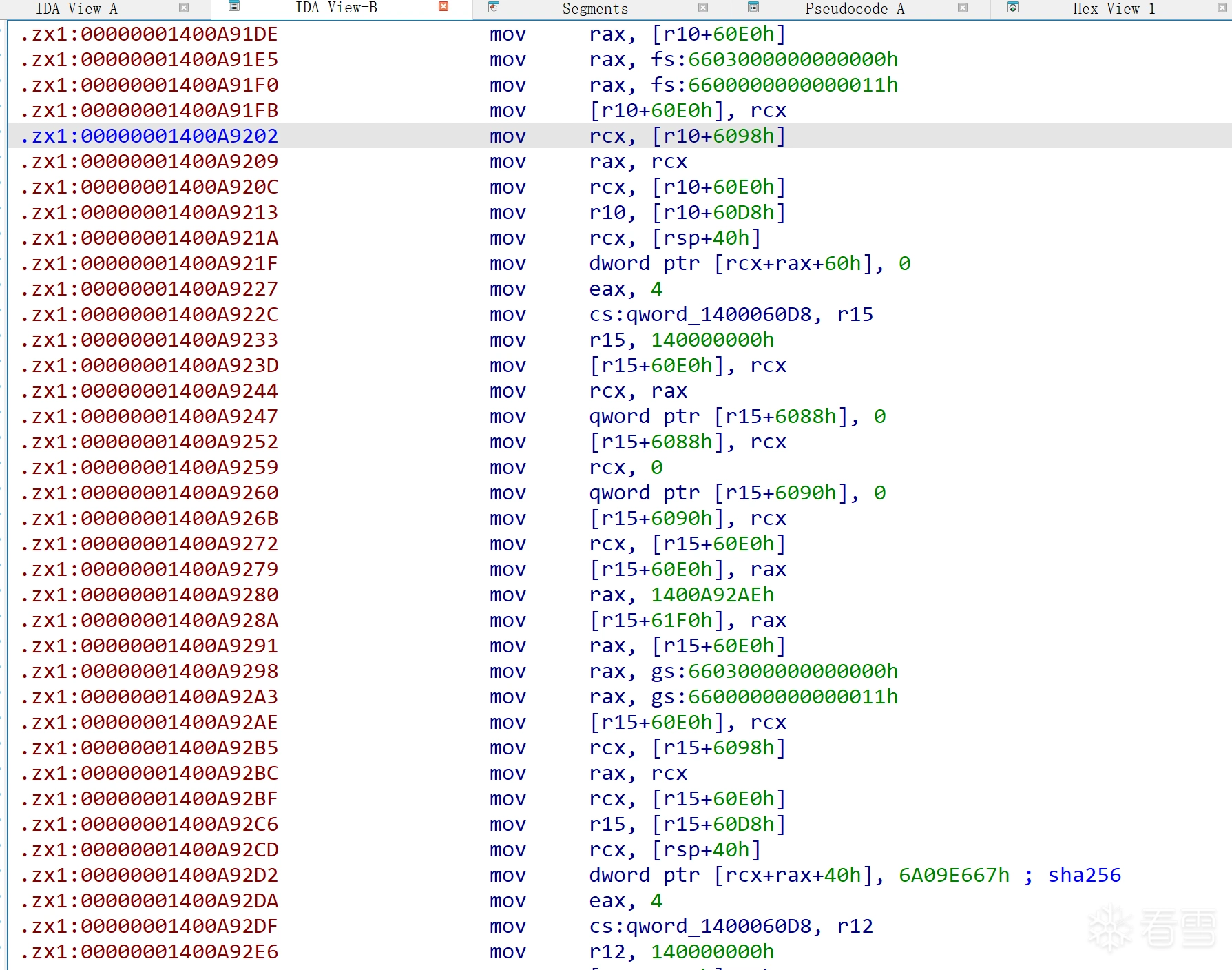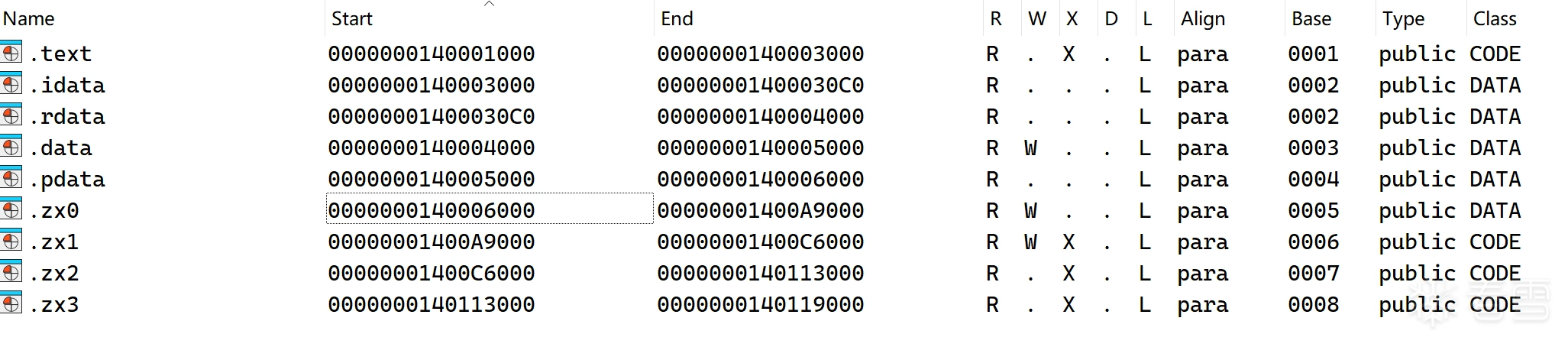 观察到sub_140115000与sub_140001FB0分别在段.zx3与段.zx1, 打开Segments看到特殊段有.zx0 .zx1 .zx2 .zx3:
