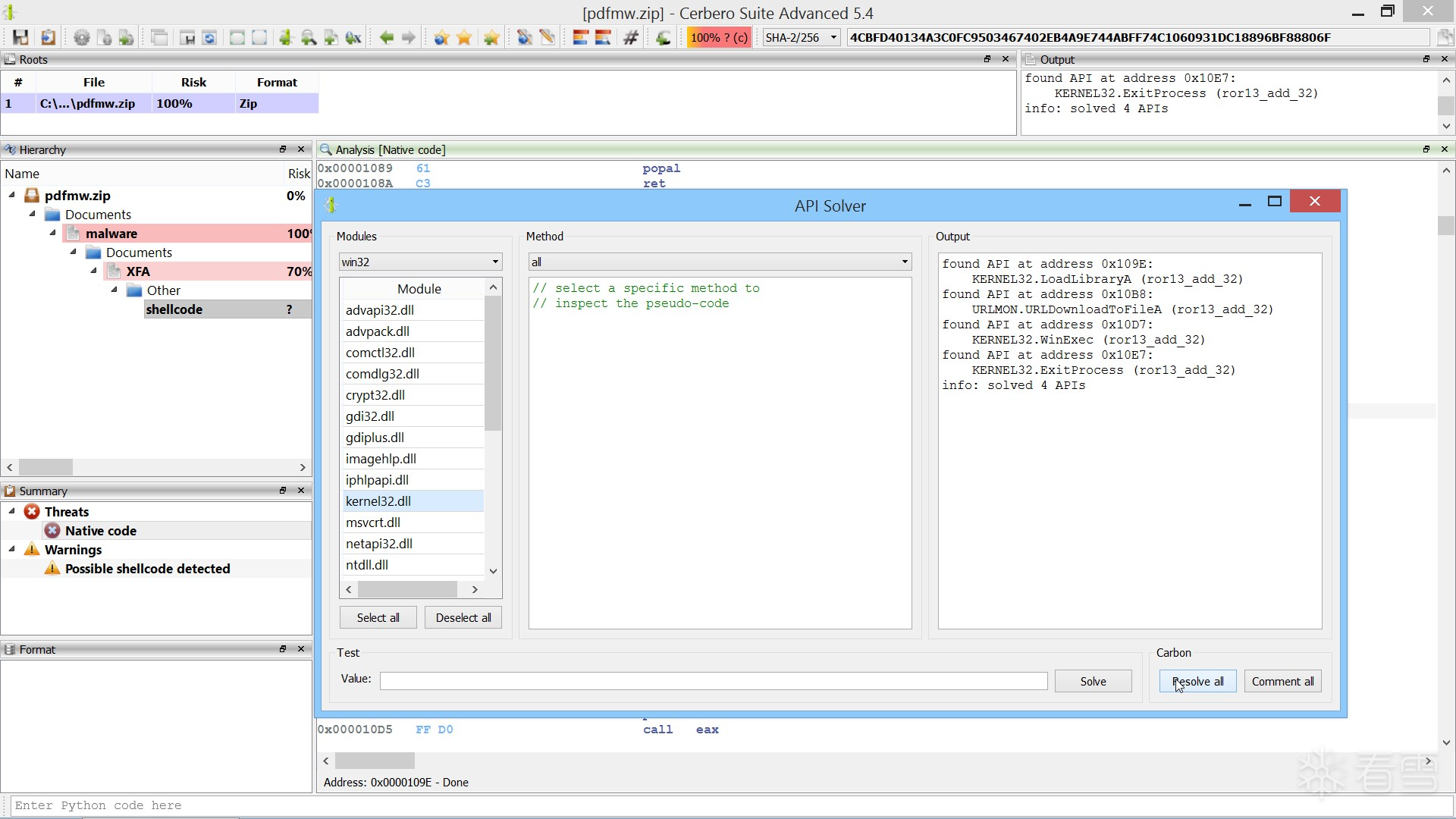 某些已破解的API哈希值包含在PDF文档中的shellcode内:
