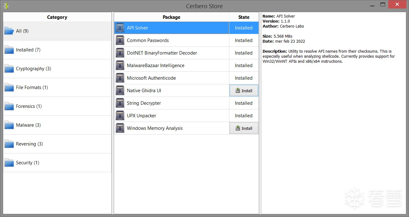 在过去几个月里,我们开始在 Cerbero Store 上陆续上架了各种用途的软件包。其中包括“MalwareBazaar情报”(MalwareBazaar Intelligence)软件包、“微软 Authenticode”(Microsoft Authenticode)软件包、“字符串解密器”(String Decrypter)软件包、“UPX 脱壳器”(UPX Unpacker)软件包、“.NET BinaryFormatter 解码器”(DotNET BinaryFormatter Decoder)软件包,以及“API 求解器”(API Solver)软件包。