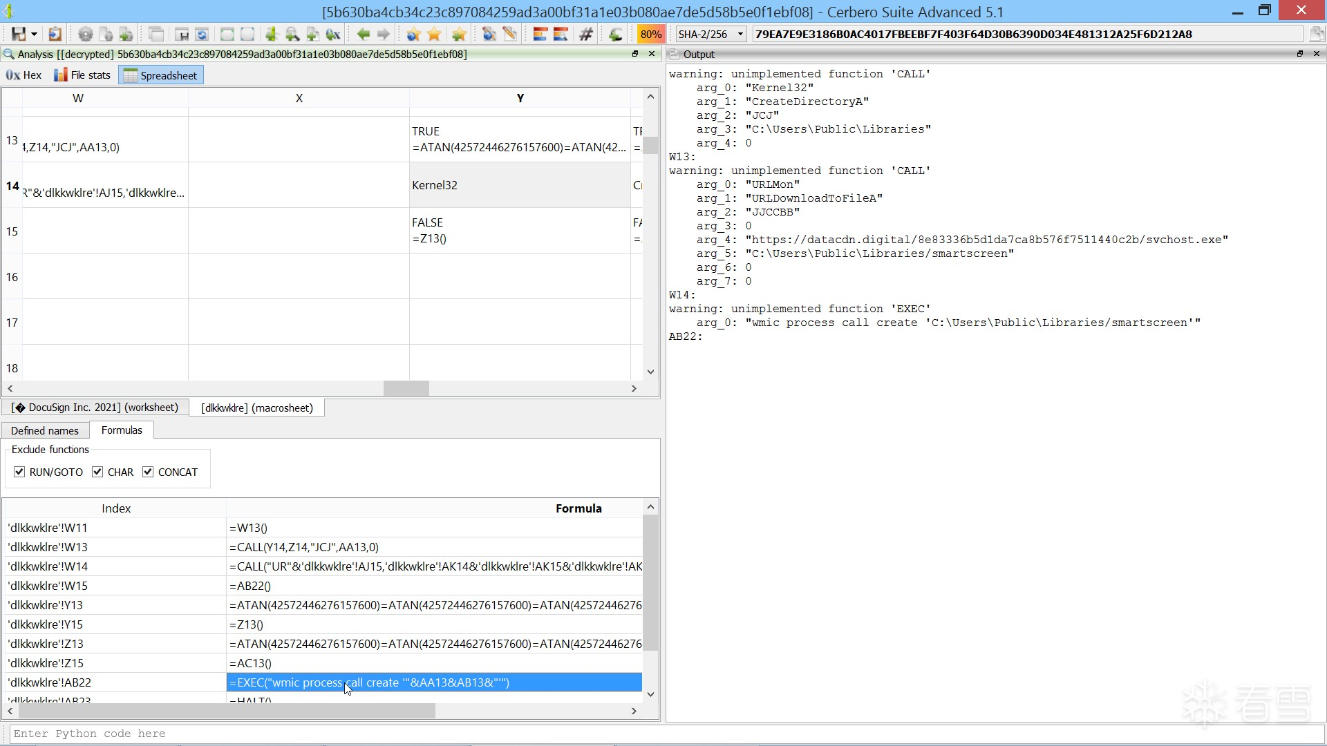 脚本共修改了 12 个公式。此时,我们可以轻松识别出 CALL 和 EXEC 宏,并使用 Silicon Excel 模拟器对其进行模拟执行(Ctrl+E)。