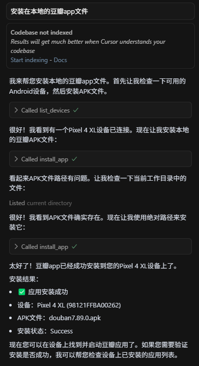 比如安装一个app,大模型会先检查现在的连接的设备list_devices,拿到设备信息get_device_info,然后安装install_app,安装完成之后再次检查是否成功list_packages 这一切都不要我们关心,我们只需要发送一个指令,安装xxx就可以