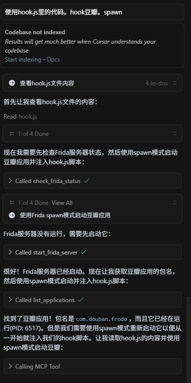 我发现,在目前AI编程软件顶多只能做静态分析,可以与电脑交互,但是无法与手机进行交互,更不用说进行动态分析。所以,要想让大模型进行逆向,要解决两个问题