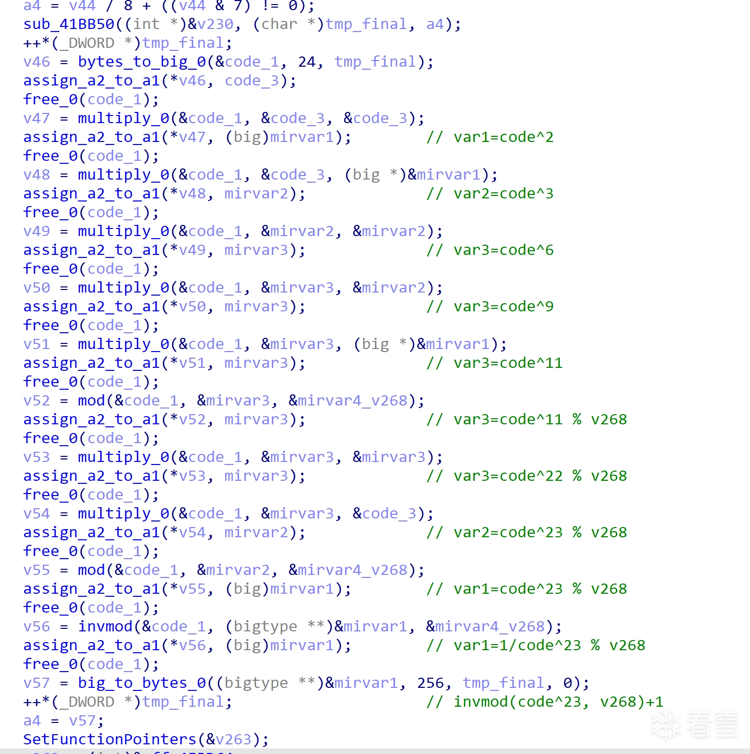 之后别的函数又是新的大数库, 在基本确认都在用某个库做指数模逆计算时,可以通过观察找到乘法函数与取模函数的输入输出,结合变量传递关系就可以找出某一段运算的指数, 分析出指数分别为[3,7,11,17,19,23,29,31,37];