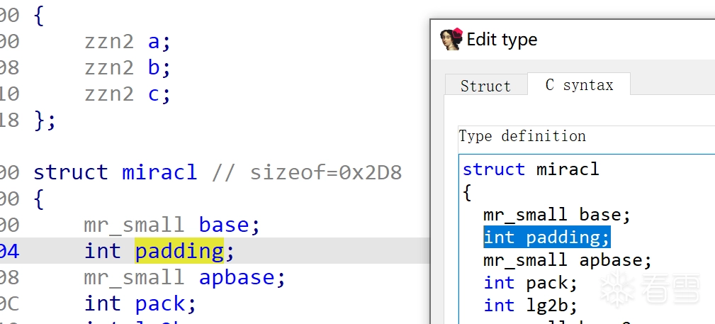 该库中的函数大量引用了mr_mip, 用ida File->Load File->Parse C header file加载库中定义了miracl结构的miracl.h来还原mr_mip的符号, 之后发现结构体成员位置不太对, 还需要对比添加一个padding: