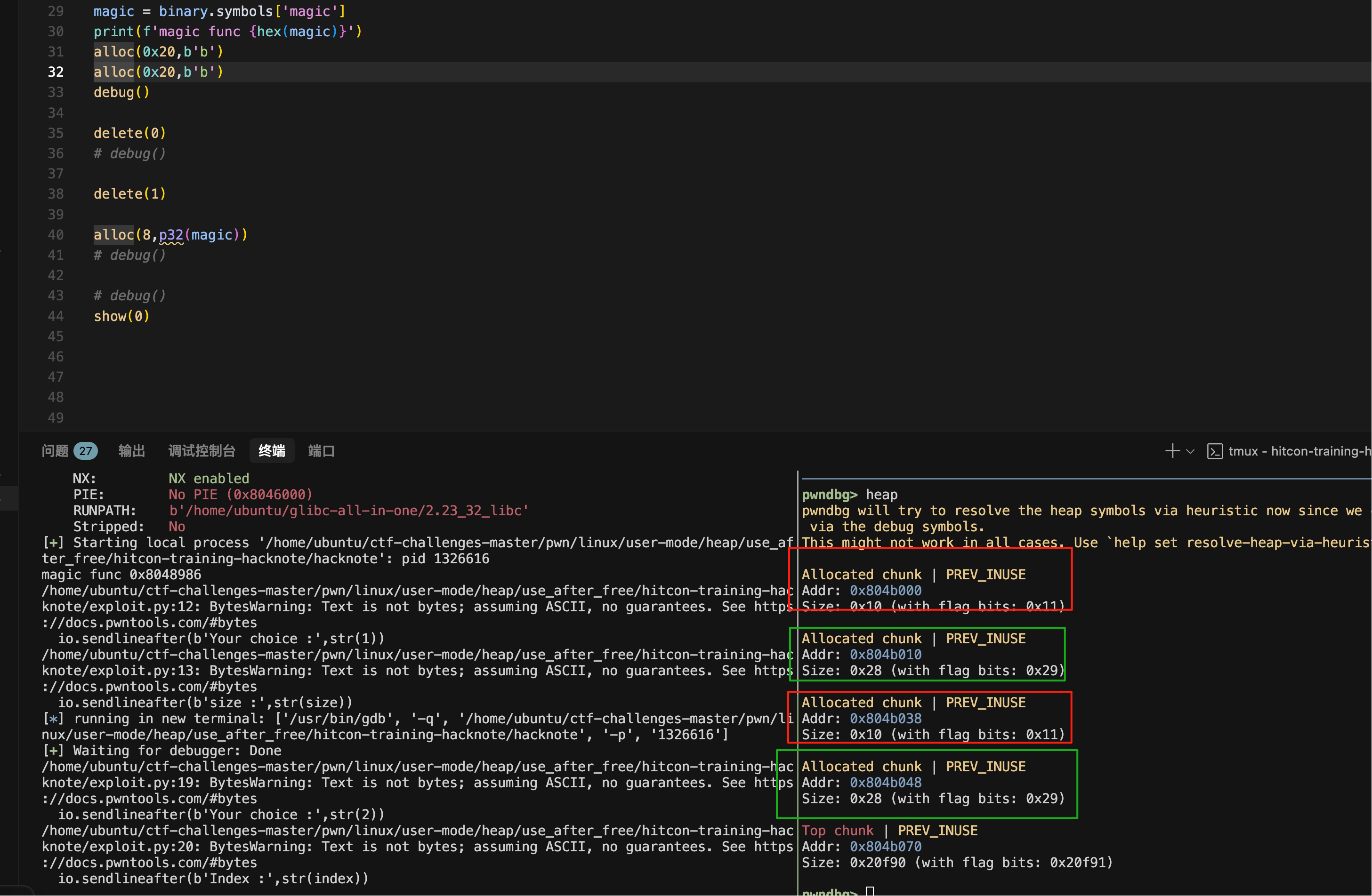 后门函数是magic,利用手法就是通过UAF漏洞覆盖print_note函数中引用的指针,将这个地址改为magic的地址即可完成pwn
