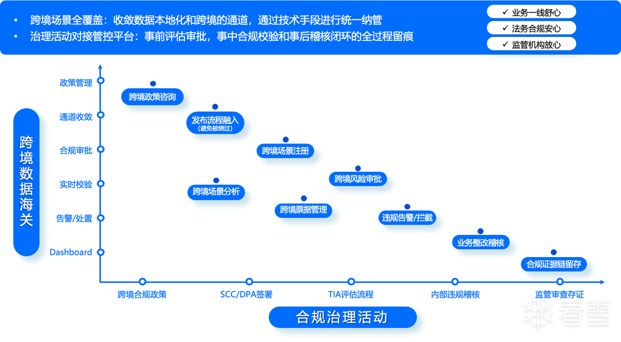 这套跨境合规管控平台,通过集中梳理和收敛数据跨境场景,建立不可绕过的合规跨境通道,整合统一的 TIA(Transfer Impact Assessment)平台,向业务团队、法务合规和审计人员提供“一站式”的合规跨境服务;同时通过技术手段确保跨境合规审批与实际跨境数据的强一致性,让所有跨境行为“合规”“透明”和“可控可管”。