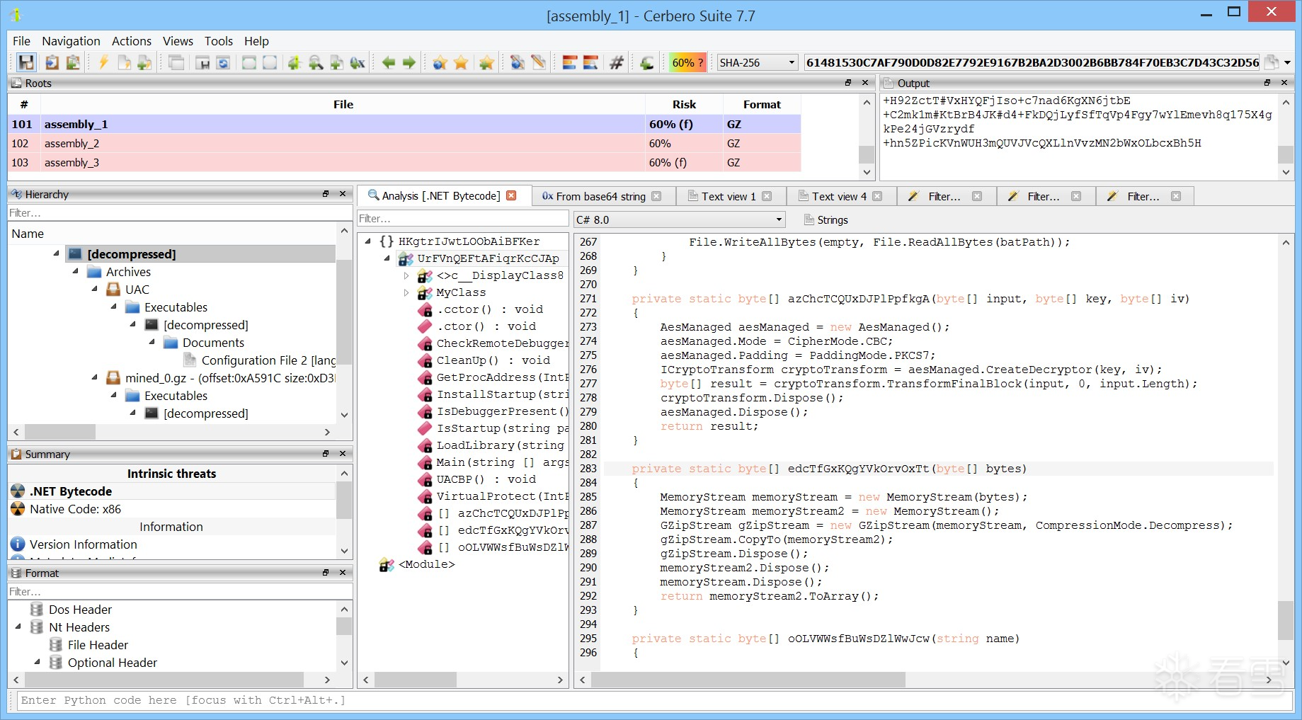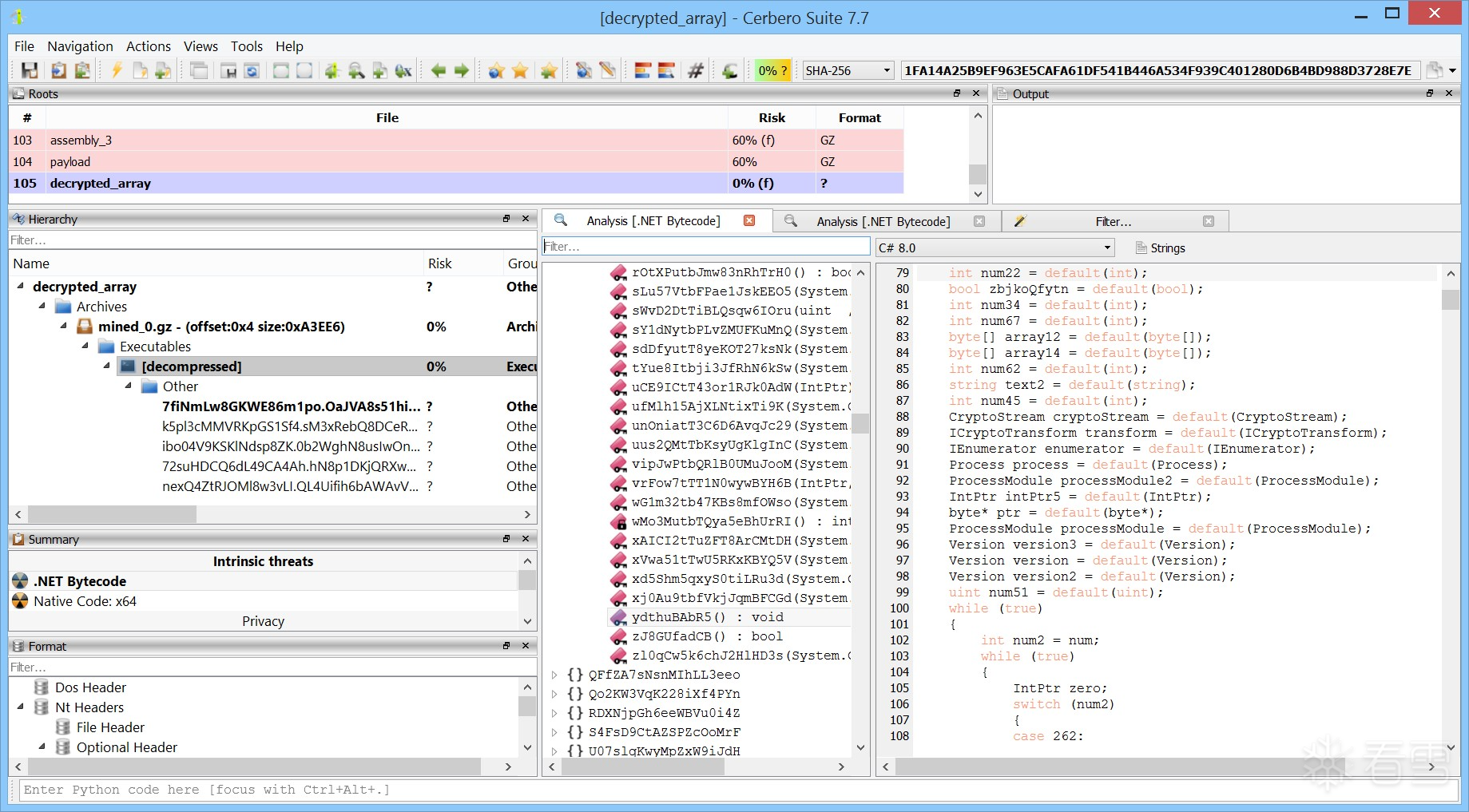 File Miner 成功识别并提取了 GZip 数据。最终得到的 .NET 程序集经过了重度混淆,其代码结构复杂,变量名无意义。至此,静态分析的路径基本到达终点,若要继续深入,需要进行繁琐的代码去混淆(deobfuscation)工作。
