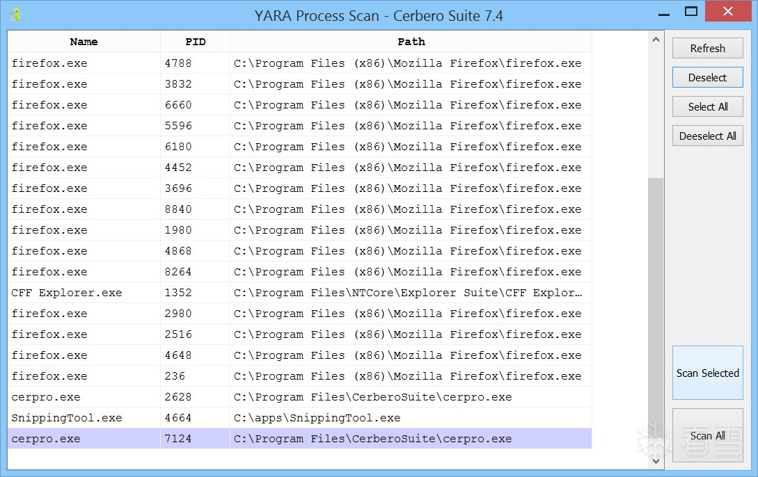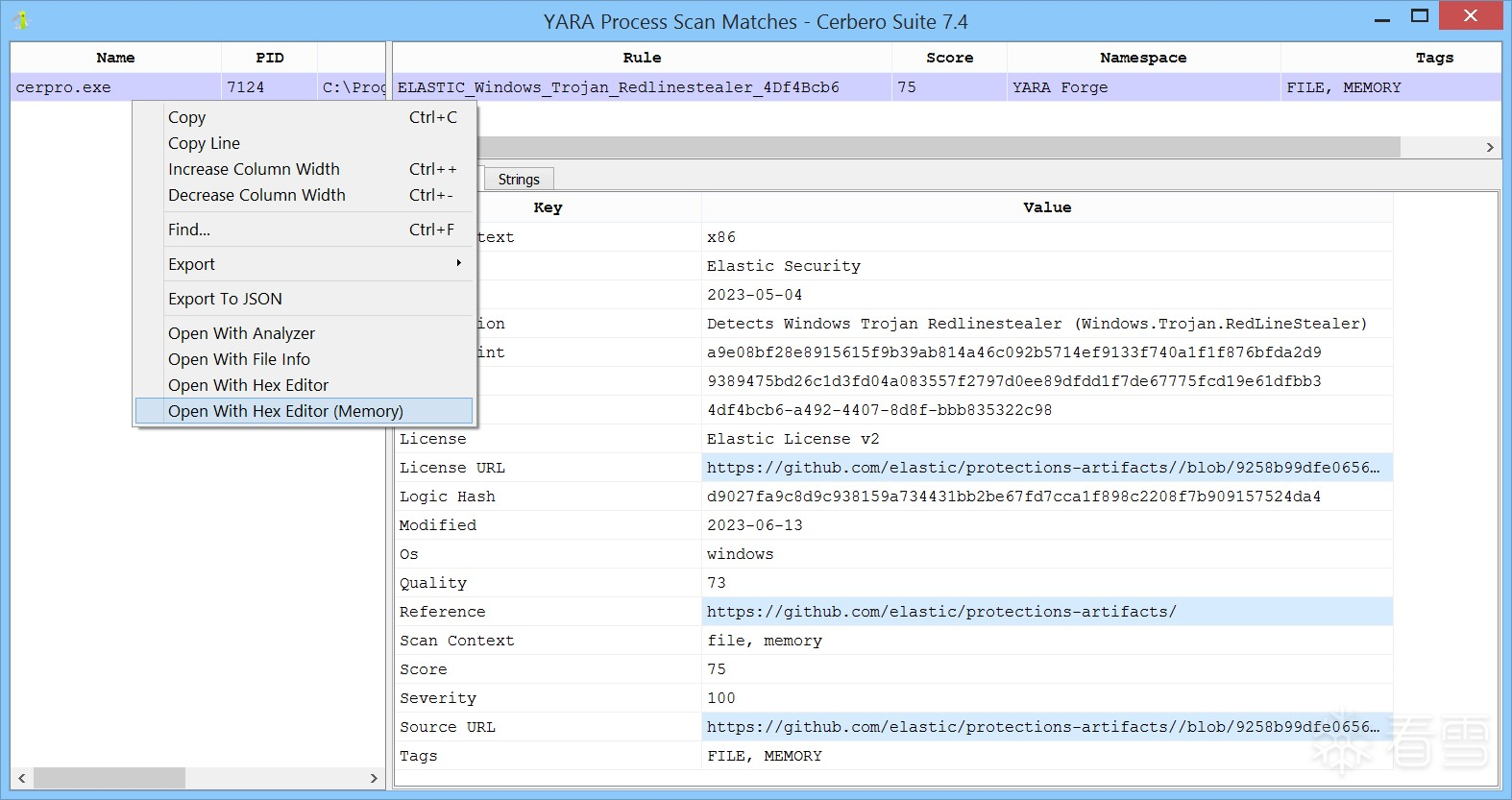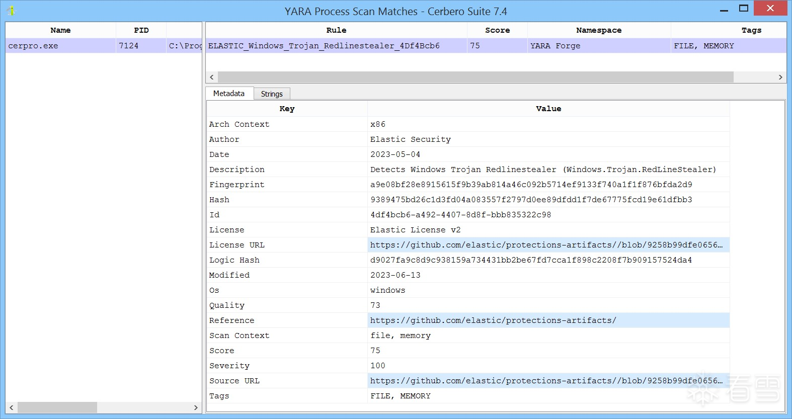 在此示例中,我们在 Cerbero Suite 实例中打开一个恶意软件样本,并对其进程进行扫描,得到了以下匹配结果。
