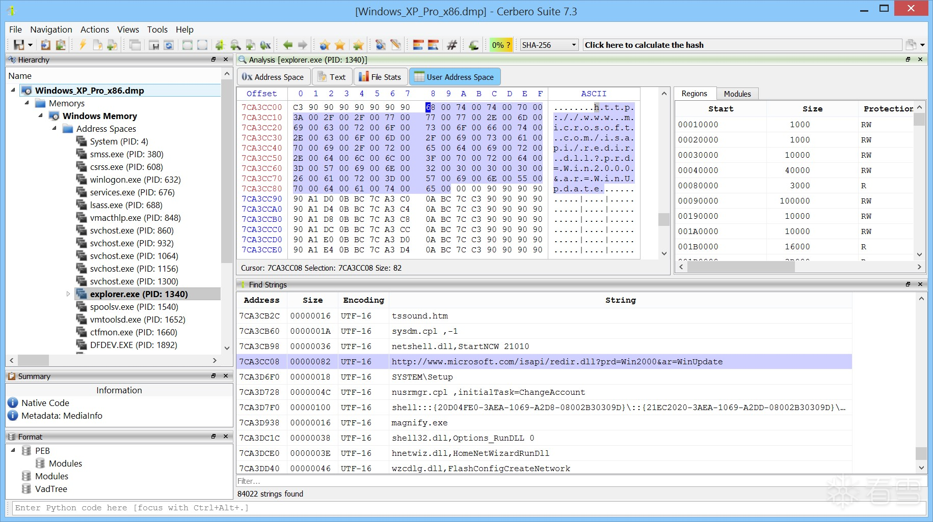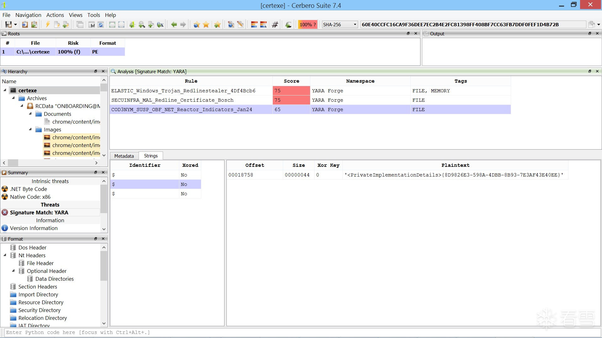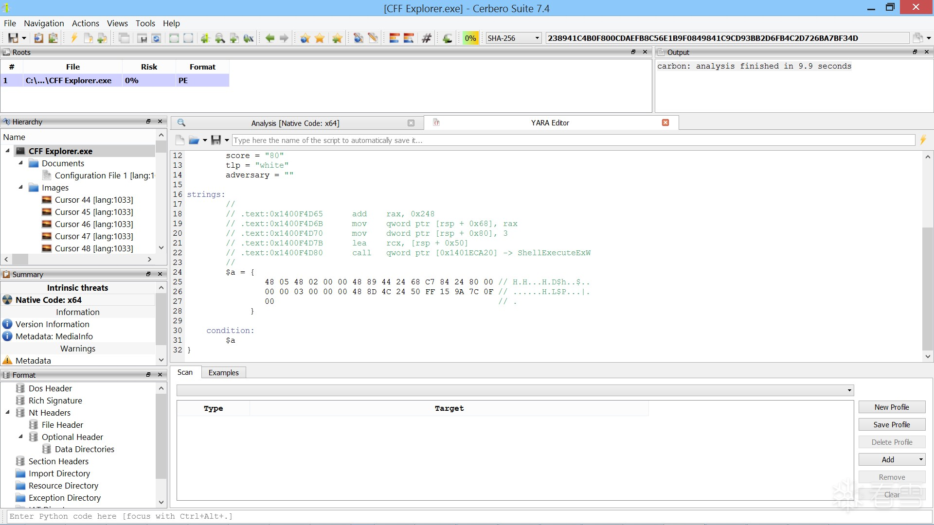 在此示例中,我们在 Cerbero Suite 实例中打开一个恶意软件样本,并对其进程进行扫描,得到了以下匹配结果。