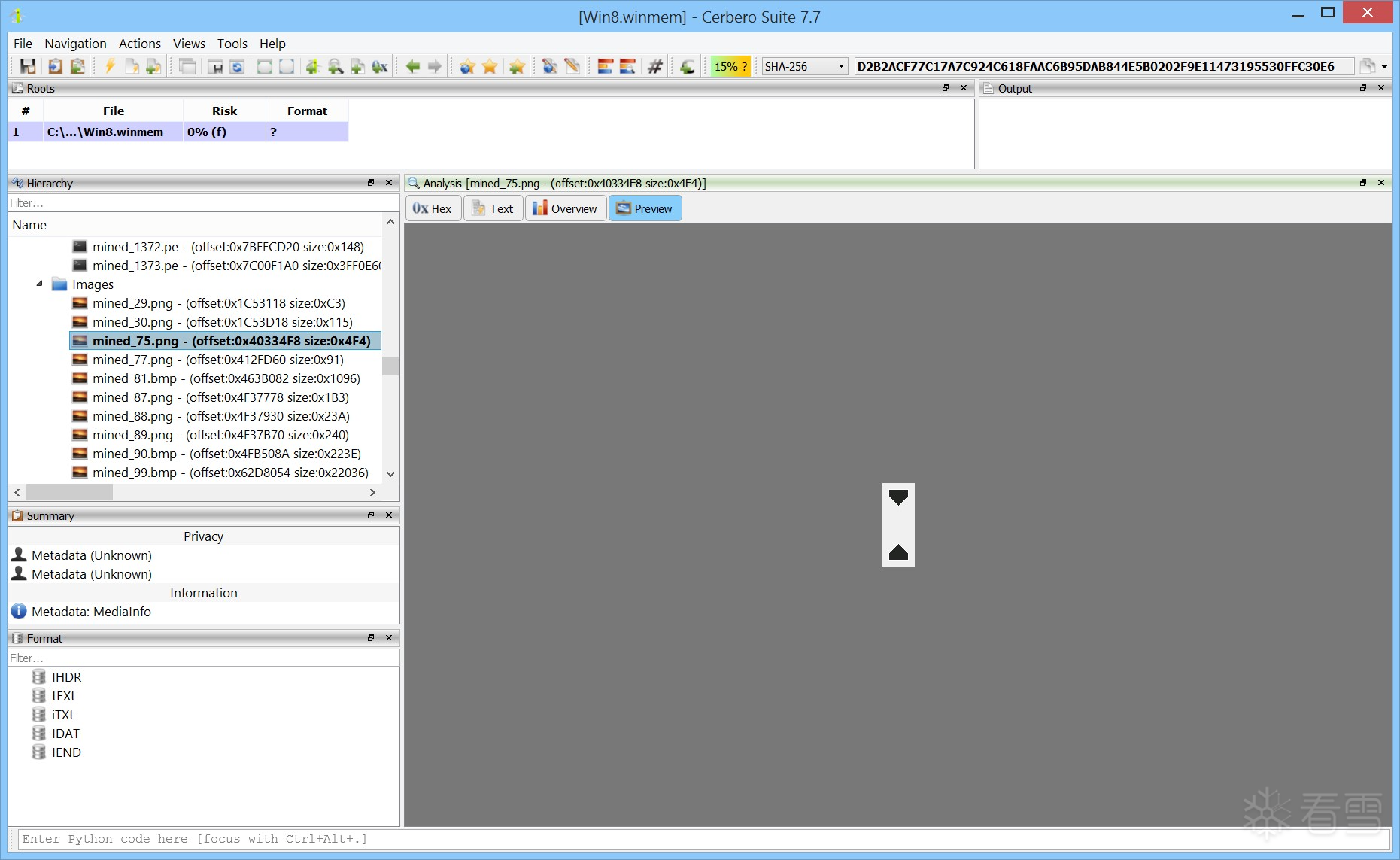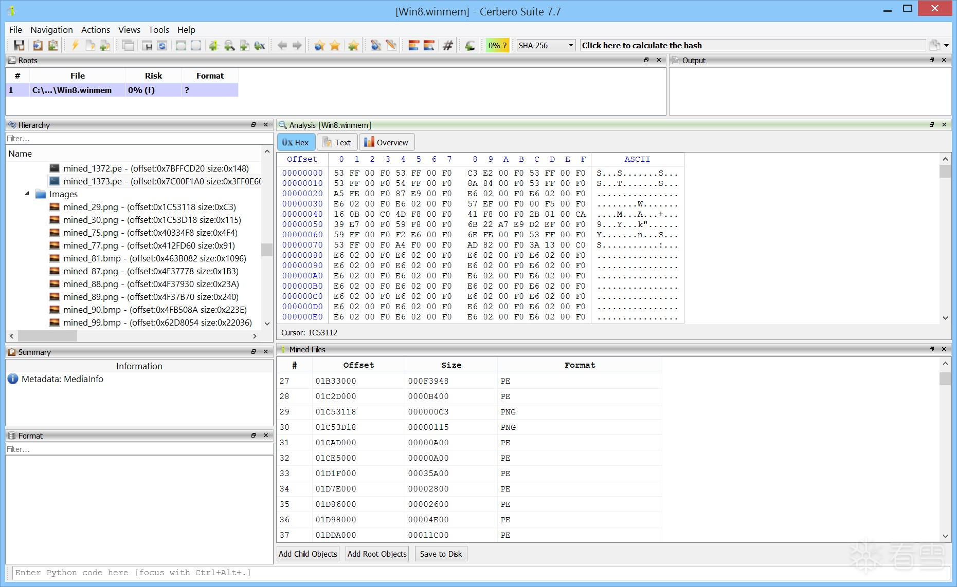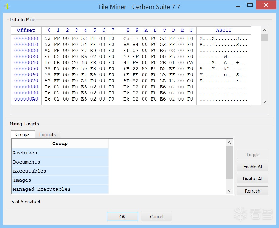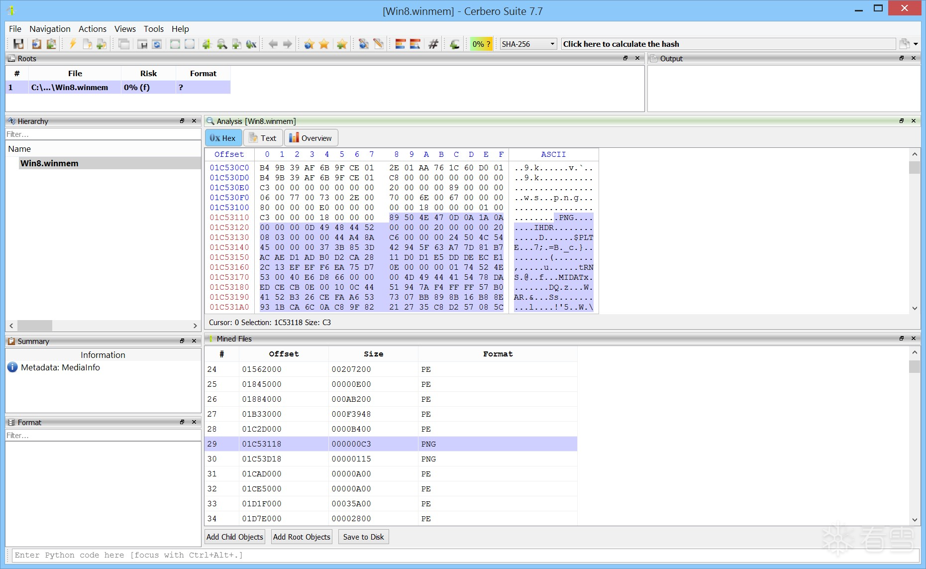 File Miner 可作为操作功能从任意十六进制视图中启动。例如,我们将其应用于一次内存转储的数据中。
