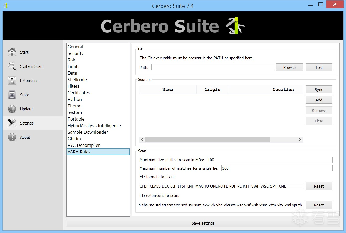 在 YARA 规则的设置页面中,您可以配置用于文件扫描的规则来源。您可以指定远程 Git 仓库和 Zip 压缩包,也可以添加本地文件或目录。