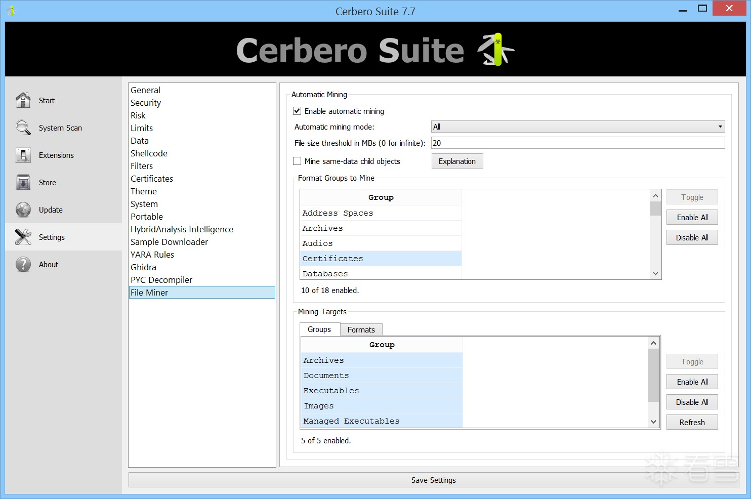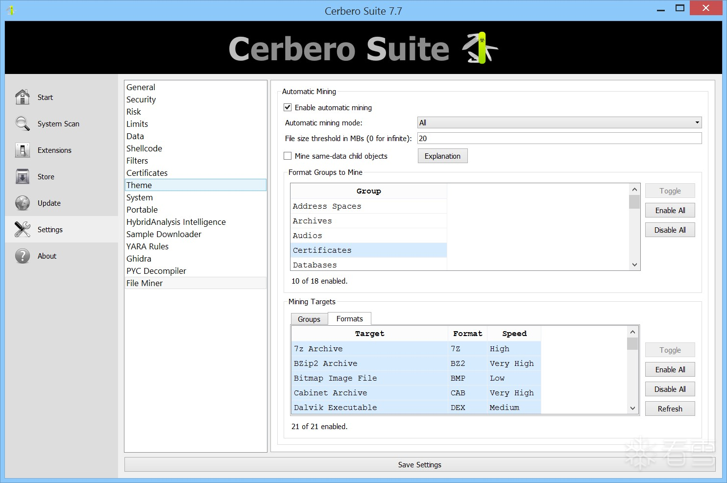 File Miner 提供通过设置页面进行灵活配置的功能。默认情况下,它会智能地从特定文件组中选择性地还原文件,例如自动排除压缩包类文件(因为对归档文件进行还原通常没有实际收益)。