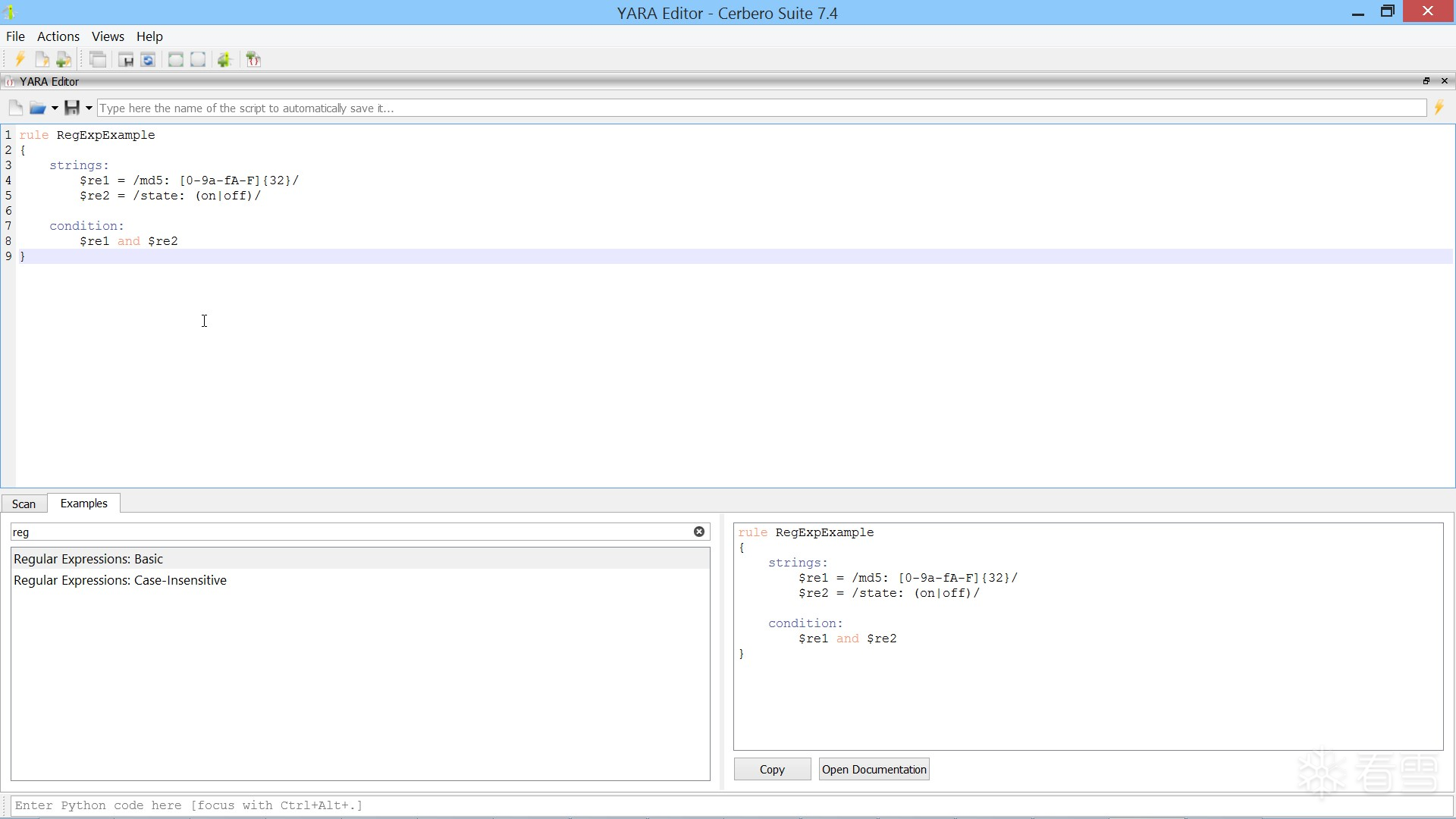 每个示例在官方 YARA 文档中都有更详细的说明,您可以通过“打开文档”按钮访问。