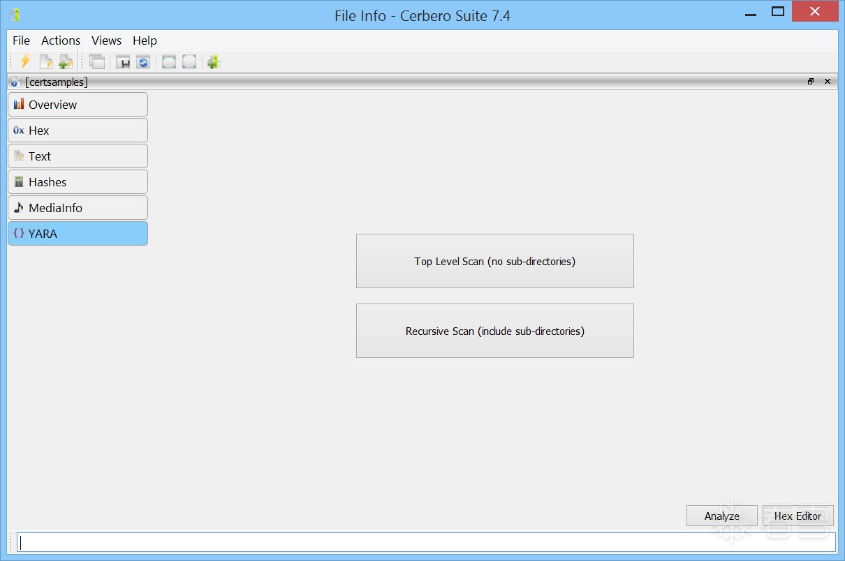 “扫描(旧版)”操作提供了此前 Cerbero Suite 内置但现已从主安装包中移除的旧版 YARA 扫描功能。