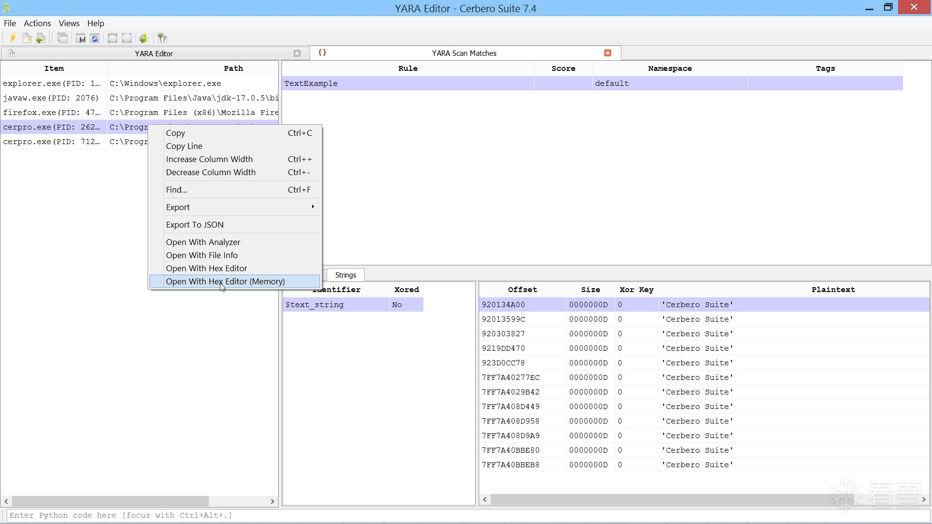 虽然编辑器是创建和编辑 YARA 规则的绝佳工具,但它也可用于在文件、目录和进程中进行快速搜索。下图展示了一个如何快速在所有进程中搜索字符串,并在内存中检查匹配结果的示例。