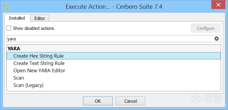 - “创建十六进制字符串规则”和“创建文本字符串规则”操作:根据当前选中的内容生成相应的 YARA 规则。