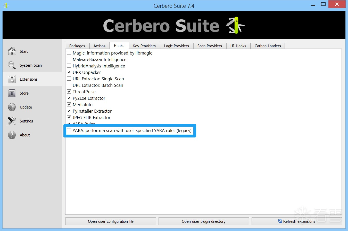 此外,旧版拦截(hook)也可用于基于 YARA 的自定义扫描。
