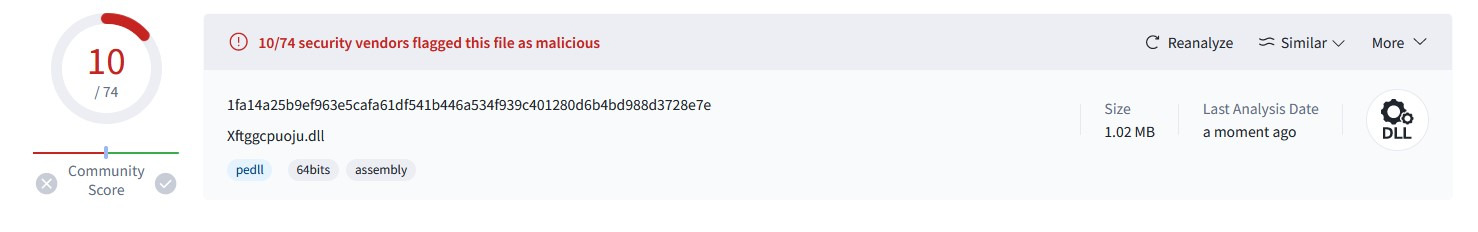 值得一提的是,该样本在 VirusTotal 上仅有 74 个扫描引擎中的 10 个 将其识别为恶意软件,表明其具有较强的规避检测能力。