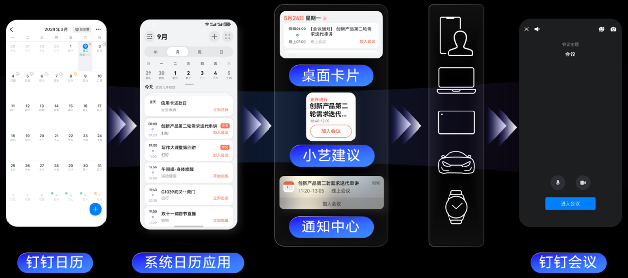 当完成了两个平台的账户关联后,日历同样实现了作为系统级应用可以多设备、多入口统一提醒,一步直达。在日历应用中以及桌面卡片、小艺建议、通知中心都能实现一键入会,并且在多设备之间实现流转。