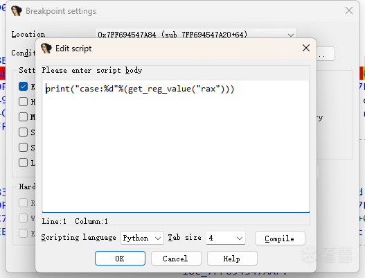 我们注意到它是switch分支结构,可以在以下这个地方下个条件断点方便我们打印case的情况