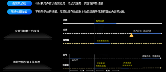 预加载分为两种场景:安装预加载和周期性预加载。安装预加载是在应用安装时,应用下载完成后,同时下载首页所需数据,用户打开App进入首页时即可直接渲染本地数据,实现瞬间加载。对于非首次打开App的情况,则可以结合使用周期性预加载,通过向预加载服务注册周期性任务,在用户退出App时,预加载服务每隔12小时自动拉取一次首页数据并缓存本地。下次启动应用时,直接使用缓存的数据渲染,实现秒开。