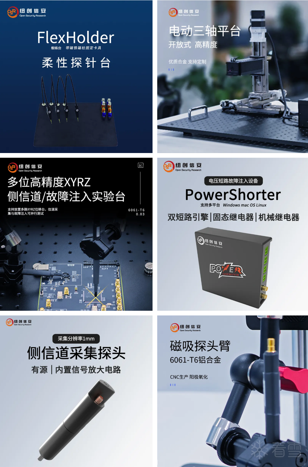 无论是电压毛刺攻击、电磁脉冲攻击,还是侧信道分析,我们都为你精选了高性价比的硬件设备:PowerShorter 短路故障注入设备、EMPulser电磁故障注入设备、UARTGuarder协议触发器、侧信道采集探头、FlexHolder柔性臂探针台、三轴平台,一站购齐,避免繁琐。