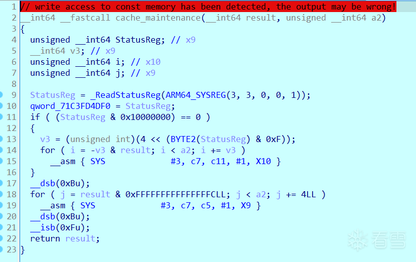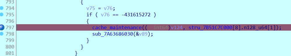 cache_maintenance()的args[0]是被解密代碼的起始地址,args[1]是結束地址,這個地址範圍中包含多個解密後的函數。