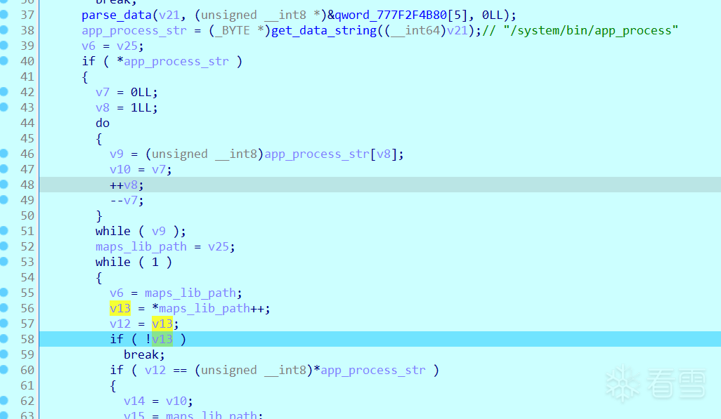 調用完check5_func2()後,解密出了"/system/bin/app_process"字串,然後與maps_lib_path對比。