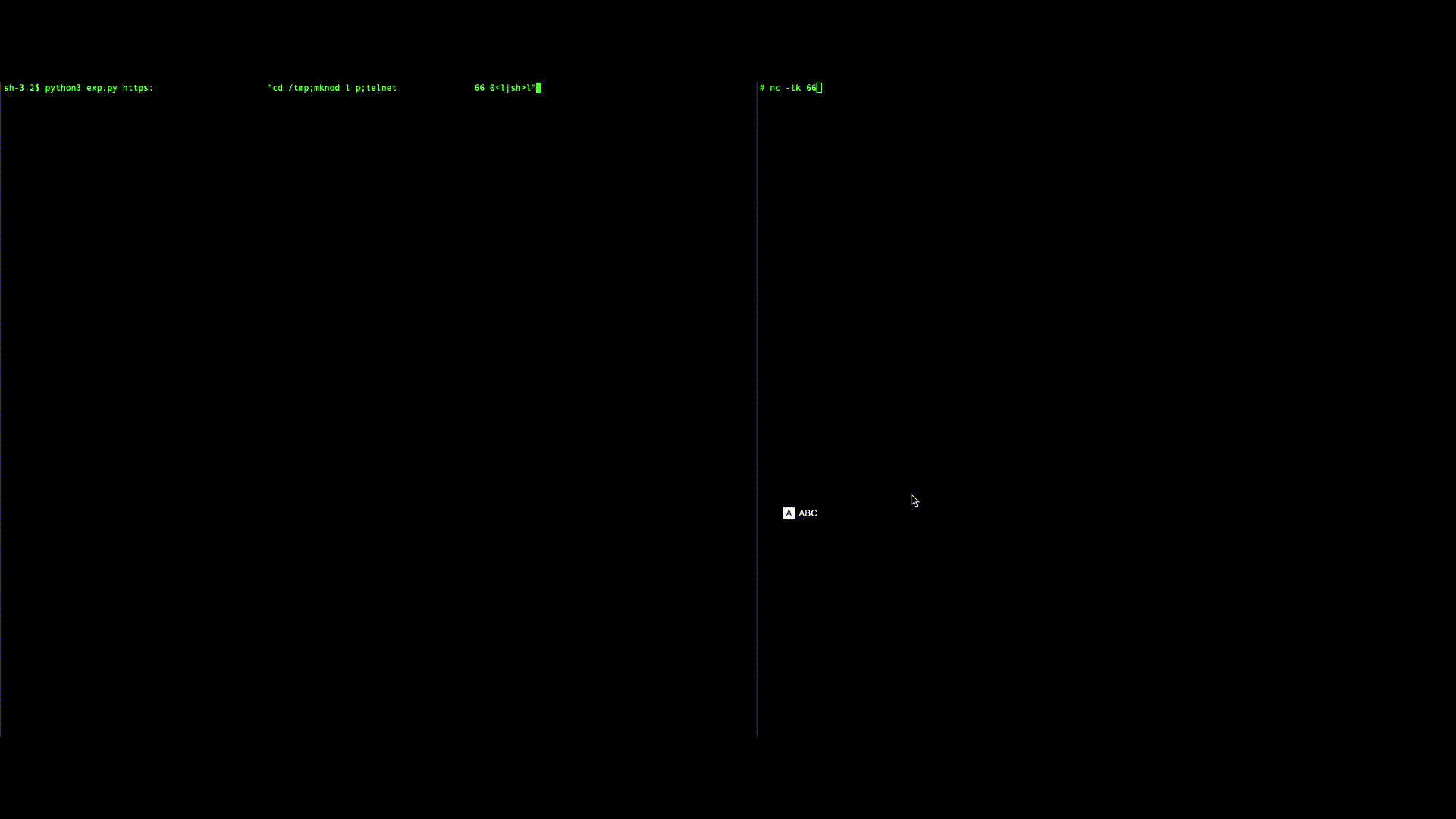 先使用漏洞1绕过身份认证漏洞,触发到`upload.cgi`,接着使用路径遍历的漏洞,创建出任意想要的文件,接着访问特制的html文件,触发命令注入漏洞。