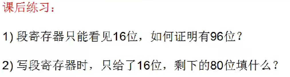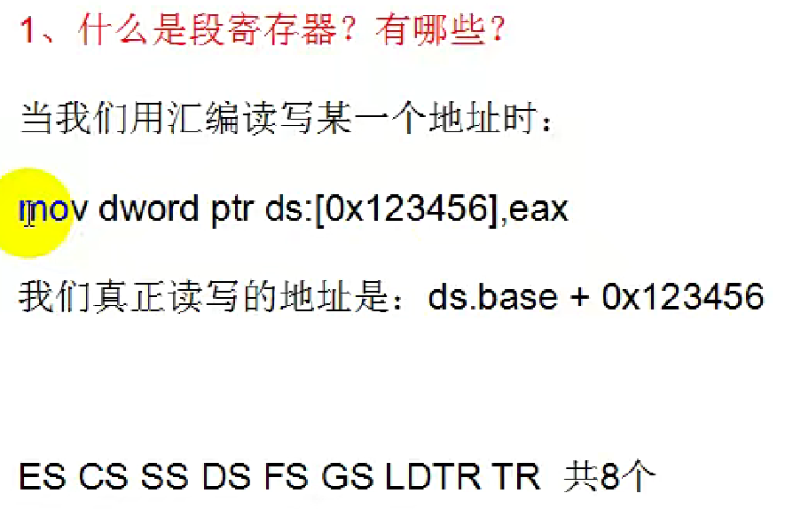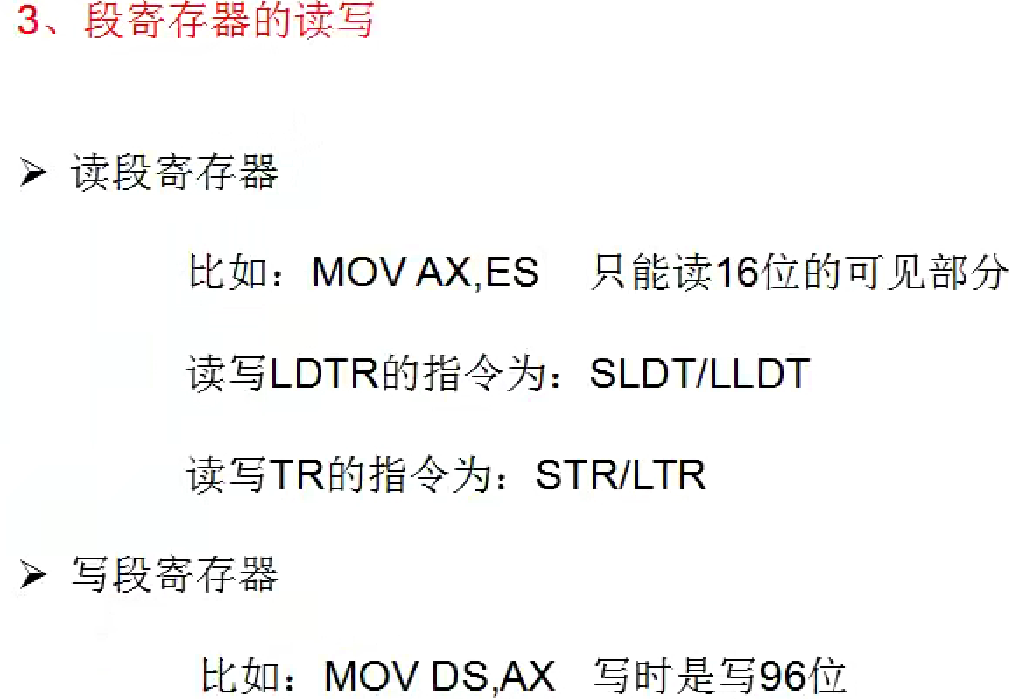 接下来演示一下对段寄存器的读与写,很多教材上说段寄存器只有16位,其实这个说法是错的,真正的说法的段寄存器的可读部分只有16位,我们在读的时候只能读它的可见部分,所以读的时候,前面要给一个16位的寄存器。接着是写寄存器,注意写的时候是96位的,换而言之,读的时候只能16位,但是写的时候是96位。