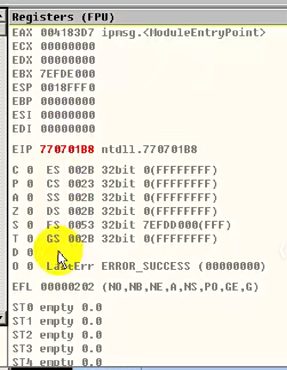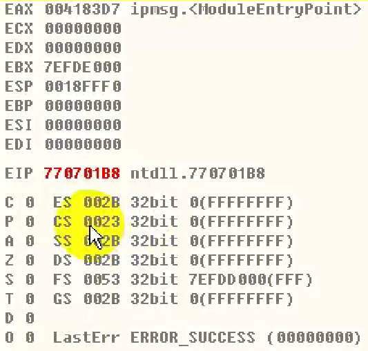 依旧是回到OD里面,可以看到每个段寄存器后面都有四个十六进制数,由于我们能看到的只有右边的16位,又因为一个字节是8位,一个十六进制数是4位,所以16位=2字节=4个十六进制数,所以每个段寄存器后面有四个十六进制数