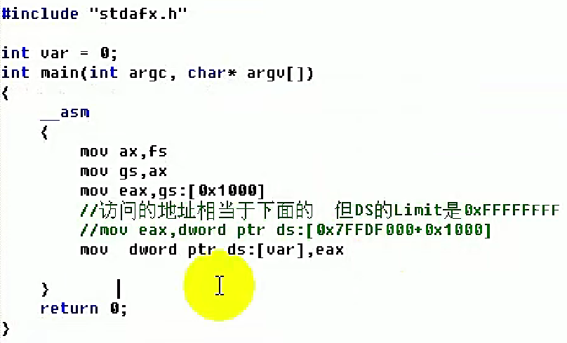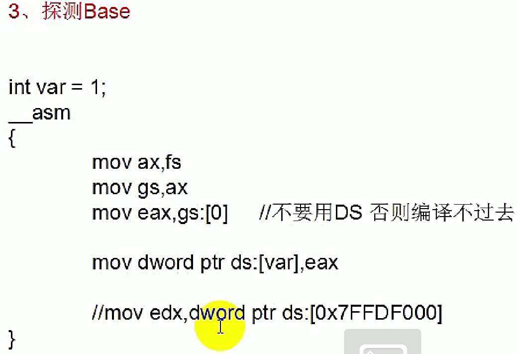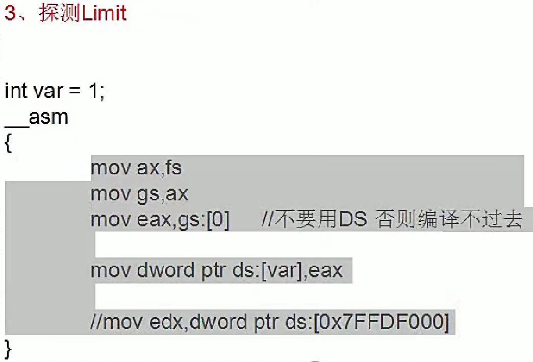 Base属性是除了FS段寄存器以外,其他的段寄存器的值全是0,我们来探测一下Base属性。这里gs存储的值是fs存储的值,注意这里不能用DS,否则会编译不过去。有点编程基础的人都知道,这个0也就是[0]地址是不能读也不能写的,但是这里编译执行没有报错,是因为实际上我们并没有读0这个地址,结合上一节课说的,我们对任何一个地址的读和写的操作,都相当于当前段的Base加上这个地址,而现在当前段的地址是FS,所以说真正读的地址是FS.Base+0而不是真正对这个0进行读取,也即这里真正读取的地址是0x7FFDE000,那么通过这个探测,我们也是知道了Base属性是确实存在的。