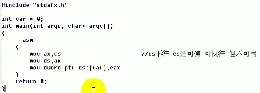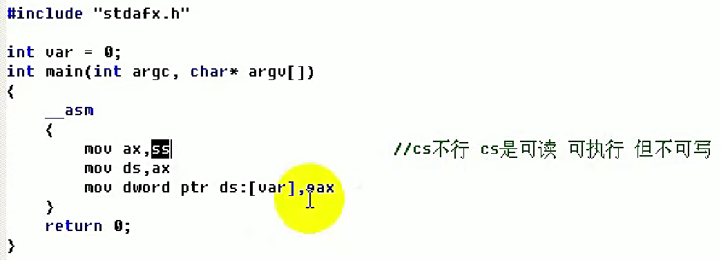 我们先来探测其属性是否存在以及是否起作用。如上图所示,我们把SS段寄存器的内容放到ax这个16位通用寄存器中,接着把ax寄存器的值赋值给ds段寄存器中,然后把eax的值赋值给ds:[var]中,这里的ds由于拿到的值是ss,所以这里也就是相当于ss:[var],ss是可读可写的,所以这里编译运行没有任何问题。