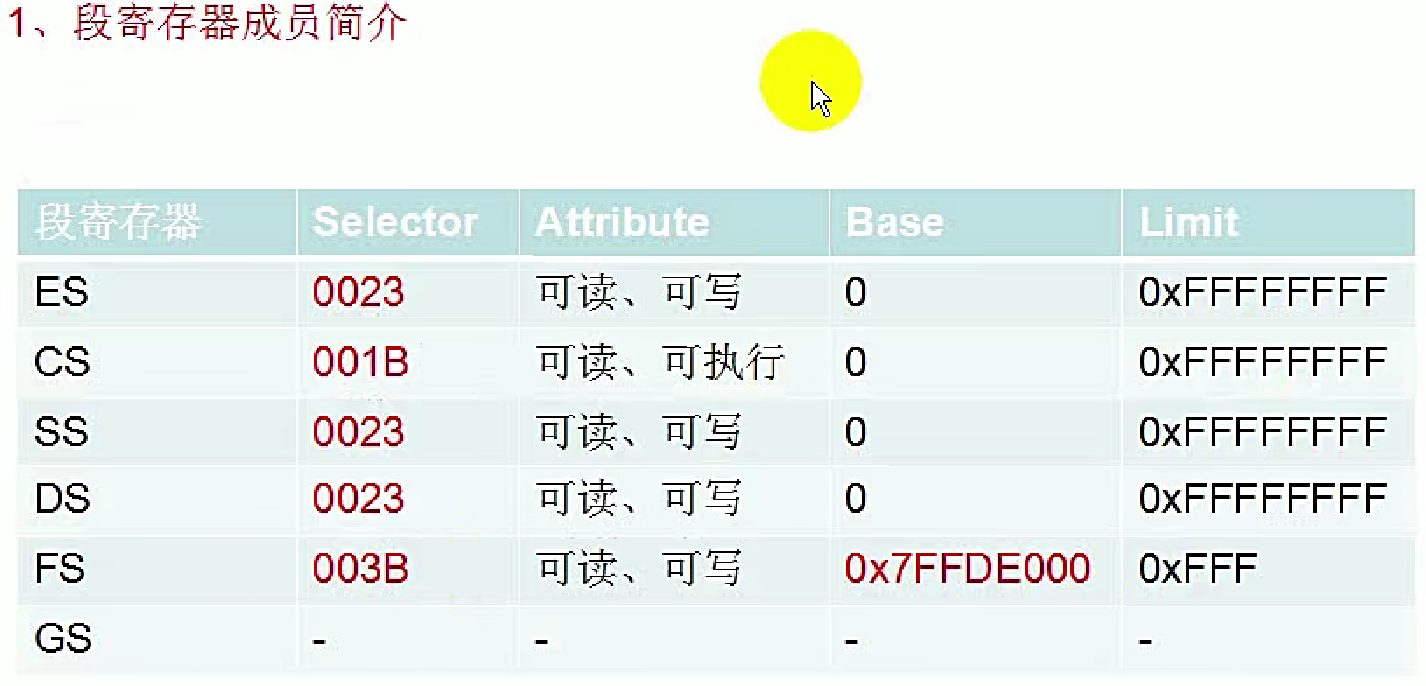 xp系统里的值如上图所示,如果系统不一样,那么这些段寄存器的值可能会不一样,也就是红色部分的值是有可能会发生变化的。这个GS的段寄存器,Windows没有使用,所以这里用下换线-表示。Attribute属性里,除了CS段寄存器以外,其他的都是可读可写的;再来看一下Base,除了FS段寄存器以外,其他Base全部都是0;最后再看一下Limit,除了FS段寄存器,其他的段寄存器的界限都是8个F。