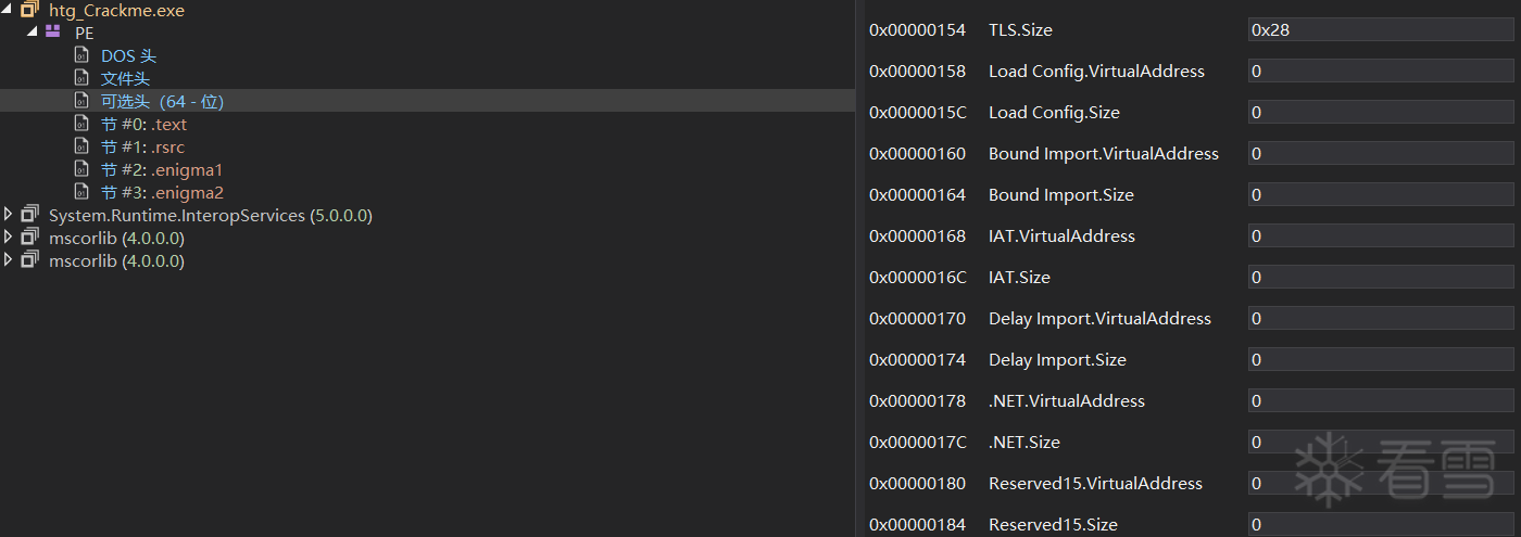 动态分析其值的来源发现其来自0x00000001407A8068开始的地址,位于enigma1的TlsCallbacks处;