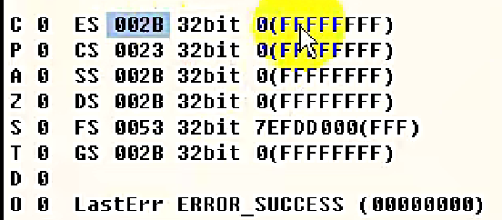 通过上图我们可以看到两个点:1.FS除外。2.所有的其他段寄存器(不包含LDTR和TR),其他的都是FFFFF FFF,也就意味着G位都是1。