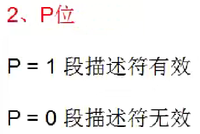 当我们通过指令将一个段描述符加载到段寄存器的时候,CPU第一件事就是检查P位看是否是有效的,如果P位等于0,那么后续的检查就不做了,只有当P位为1的时候才会做后续其他的检查。这就是P位,一个说明当前段描述符是有效还是无效的位。