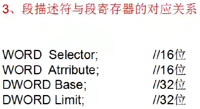 cstruct Segment_Register { WORD Selector; // 段选择子,16位 WORD Attribute; // 段属性,16位 DWORD Base; // 段基址,32位 DWORD Limit; // 段限长,32位};总结表