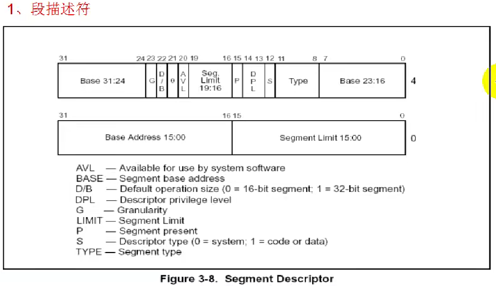 Descriptor Type:指定当前到底是代码段还是数据段(这一位由S决定,表里已拆开)。