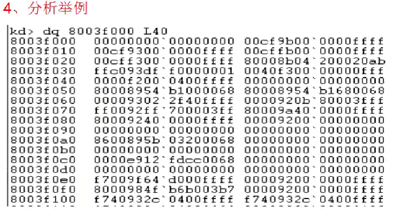 另外这里还额外提了一下DPL位,说是让记忆一下,DPL位也就是13、14位,在Windows里面只能出现两种情况,或者都是0、或者都是1。如果我们想分析代码段和数据段的Type域的属性,那么S位必然为1(S位性质),P位也必然为1(为1时才有效),DPL如果都为0,那么这几位的值就是1001也就是9,反之如果DPL位都为1,那么就是1111也就是F,所以当我们把GDT表拿出来的时候,如果我们想分析代码段或者数据段的时候,只需要看十六进制的从左往右数,索引从1开始,第五位是不是9或者f即可。其他的就不用管了,因为其他的一定不是代码段或者数据段。