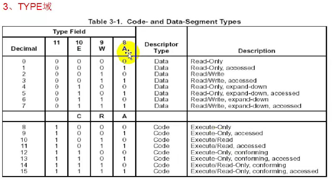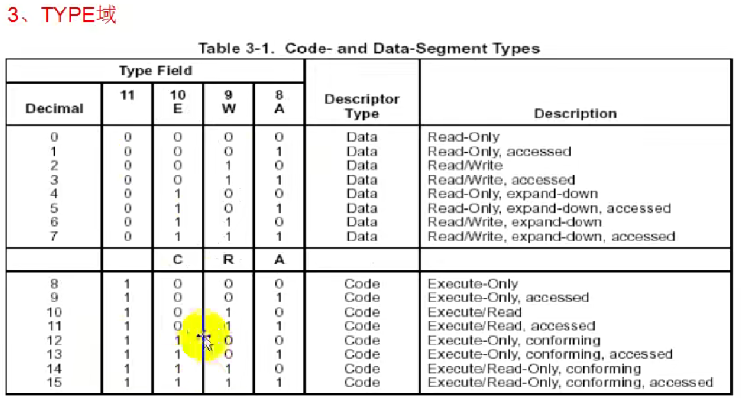 这张表只展示了S = 1(即普通段,代码或数据段)的Type域类型;系统段的Type编码另有一张表(Intel手册3.5节/3-2图)。