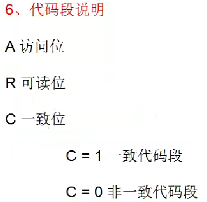 下半部分是代码段(type 8~15):描述该段是否可执行,可读(R),是否conforming(C),是否访问过(A)。