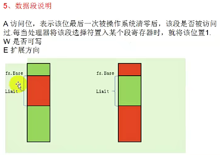 这里来举例一张图来说明什么叫向上拓展和向下拓展,选择FS段寄存器,FS有Base、有Limit,注意这里的Base不是绿色的方块,而是那一条黑色的线,也就是Limit的顶端那条黑线。Base指的是这个段描述的数据从哪里开始,Limit指的是描述的段有多长。向上拓展指的是你描述的地址的有效范围是Base开始到Base+Limit结束,也就是图中左侧的红色部分是向上拓展的时候,是有效的;如果当前的段是向下拓展的,那么有效地址指的是除去Base+Limit以外的部分。