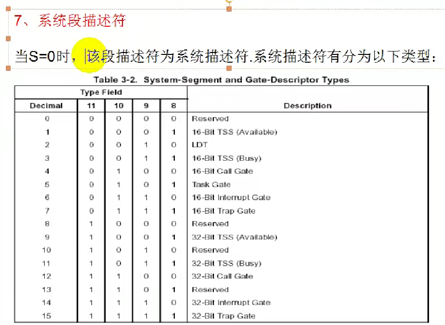 S=0:该段描述符描述的是系统段,包括任务状态段(TSS)、局部描述符表(LDT)、调用门、中断门等,这些不是普通程序段,而是用于操作系统管理的特殊数据结构。
