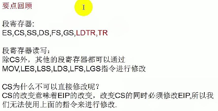 CS寄存器的作用:CS寄存器存储了当前正在执行的代码段的段选择子(在保护模式下指向GDT或LDT中的段描述符),CPU根据CS:IP(或CS:EIP)的值决定下一条指令的位置。