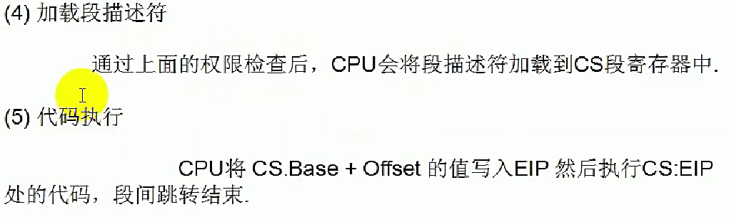 - 经过权限检查,CPU正式将该段描述符加载到CS寄存器,更新CS的内容(段选择子)。