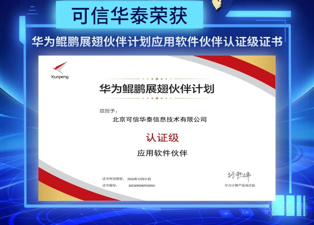 可信华泰近日宣布荣获“华为鲲鹏展翅伙伴计划”认证