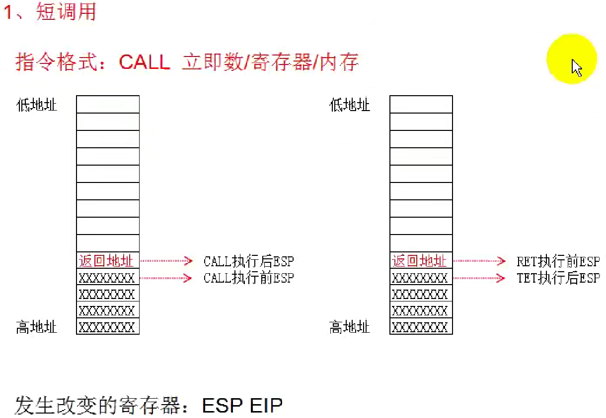 好的,这张图展示了x86汇编语言中一个非常基础且核心的概念:短调用(near call) 以及与之相关的堆栈操作。这对于理解程序执行流程、函数调用机制以及逆向工程和漏洞利用都至关重要。