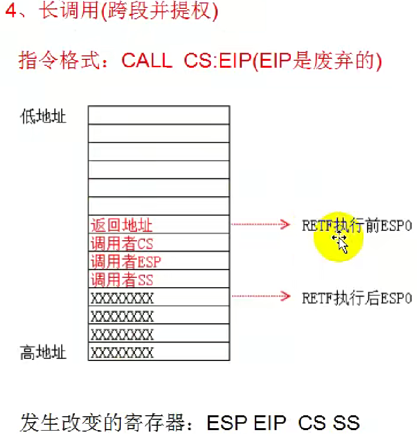 远调用 (Far Call) | 不同代码段 | 有 | 切换到新堆栈后,压入:旧SS、旧ESP、旧CS、旧EIP | ESP 指向新堆栈地址,并相应减少 |