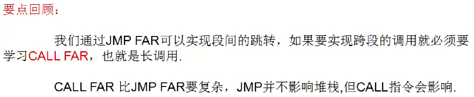 长调用的指令格式和短调用区别很大,CALL+CS:EIP,CPU真正执行这个指令的时候,是不使用EIP的,EIP实际上是被废弃掉的,前面的CS是一个选择子,CPU要查表也就是GDT表的,到这个表里面去找段描述符,这个段描述符必须是一个调用门!执行长调用的时候,最终需要执行的代码在哪里不是由这个EIP决定的,而是通过这个CS的段选择子,通过这个选择子找到的调用门,通过这个调用门找到的符号算出来的,这个在下一节课会详细讲解。这一节课只要记住长调用的指令格式就行。